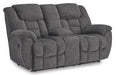 Sometimes seeing is believing. And you can rest assured that this reclining loveseat with console is every bit as indulgent as it looks. Designed to put you in the lap of luxury, the generously scaled seating—wrapped in a wonderfully plush and practical charcoal gray Next-Gen Nuvella™ upholstery—sports pillow-wrapped armrests and curvaceously cushioned head-neck support for feel-good flair.